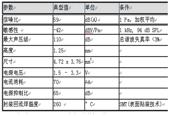 表1:新型SMM310硅基MEMS麥克風的特性參數。
