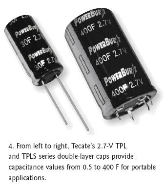 TecateGroup推出了具有多樣配置的多種PowerBurst品牌超級(jí)電容器。針對(duì)通用的脈沖電源、混合電池和便攜式產(chǎn)品應(yīng)用,徑向引線的TPL和徑向折彎的TPLS系列雙層電容器分別具有0.5F到70F和100F到400F的容量(圖4)。這兩類器件的電壓額定值都是2.7V,工作溫度范圍是-40℃到65℃。TPL和TPLS系列的最大高度分別是45mm(100F)和60mm(400F)。