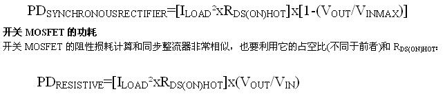 其中,RDS(ON)SPEC是計(jì)算所用的MOSFET導(dǎo)通電阻,TSPEC是規(guī)定RDS(ON)SPEC時(shí)的溫度。利用計(jì)算出的RDS(ON)HOT,可以確定同步整流器和開關(guān)MOSFET的功率消耗,具體做法如下所述。