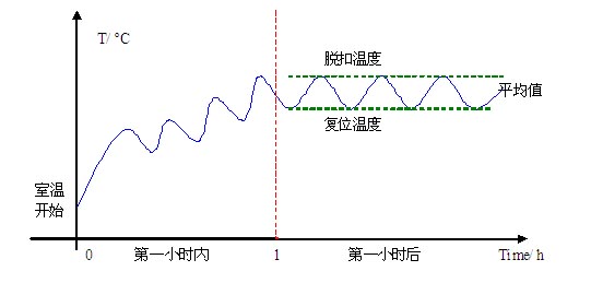 以單相馬達(dá)與自動復(fù)位熱保護(hù)器組合為例說明,其他情況請查閱相關(guān)標(biāo)準(zhǔn)。測試在室溫環(huán)境進(jìn)行,堵轉(zhuǎn)72小時,其間熱保護(hù)器必須因繞組溫度升高斷開電路又自動復(fù)位,儀器連續(xù)記錄繞組溫度,圖-1的示意圖由經(jīng)驗所得。整個過程到結(jié)束,必須符合以下結(jié)果: