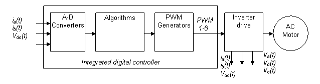 圖 1 是通用數字馬達控制系統的結構簡圖。算法可在數字控制器上實施,數字控制器生成的控制輸出可通過逆變器驅動馬達。電流及電壓測量等反饋信號通過模數轉換器 (ADC) 反饋至該算法。