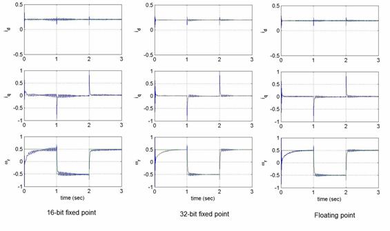 從圖中數值性能的比較可以看出,16位定點系統有若干個偽瞬態 (false transient) 與振鈴,而32 位系統則沒有這些現象。32 位單精度浮點與32 位定點的結果非常相近。