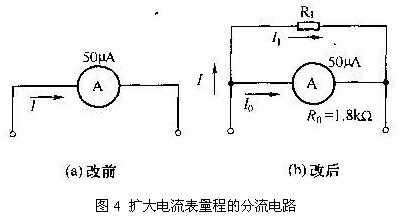 上述的分流電路計算結果表明,只要在50uA表頭上并聯一個200Ω的電阻,即可使表頭的量程由50uA擴大到500uA。