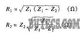 式中,Z1和Z2為網絡1和網絡2的阻抗,它們分別為300Ω和75Ω。將它們代入上面兩個公式中,則求得RI=259.8Ω,R2=86.6Ω。