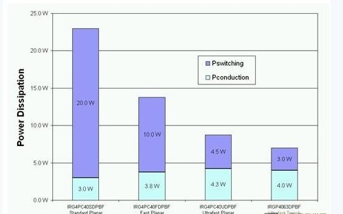 前文討論了高壓側 IGBT在20kHz或以上頻率進行切換。假設設計一個擁有230V交流輸出的1.5kW 太陽能逆變器,表1中哪種IGBT具有最低的功耗呢?圖4顯示了IGBT在20kHz進行切換的功耗分析,由此可見超速平面式IGBT比其它兩種平面式 IGBT具有更低的總功耗。