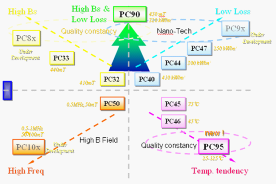 下面對高性能的材料做一個簡單介紹。LED變壓器的系統需要高飽和磁通密度和低損耗的特點,TDK開發了一個PC47系列的變壓器材料,它的發展方向就是下圖箭頭所指的方向,縱軸是飽和度磁通密度和低損耗。這邊是我們對比市面一些通用的磁芯變壓器,和TDK現在所研發和不斷更新產品特性的比較。從右下角,粉紅色的點是目前市場上常用的一些材料的性能,橫坐標是磁通量,縱坐標是飽和的密度。我們可以發現從現在市場上這些粉紅色的點是在500Core Loss,磁通密度在380,跟TDK PC40材料是相當的。PC47材已經有很大的改善,在420的磁通密度,在250左右的Core Loss,也就是說相比通常所用的系列有比較大的改善。