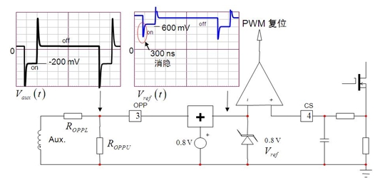 如圖 1 所示,電路中的光耦合器斷路或 TL431 分壓器網(wǎng)絡(luò)遭受嚴(yán)重漂移影響(或其某個(gè)電阻丟失或出現(xiàn)錯(cuò)誤值)時(shí),輸出電壓就可能超出規(guī)定的限制值,這就是過壓條件。大多數(shù)情況下,過壓條件可能對(duì)下行負(fù)載有害,適配器這時(shí)必須完全關(guān)斷。NCP1250/1 在 OPP 引腳上也集成了 3 V 參考比較器,這比較器可用于多種功能,如 OVP。如果這 OPP 引腳電壓連續(xù)四次超過 3 V,就使控制器 IC 閂鎖保護(hù)。
