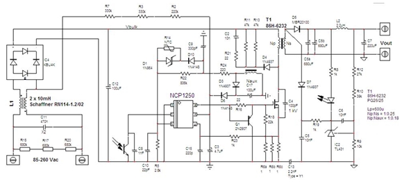 三、采用NCP1250設(shè)計(jì)65W適配器示例