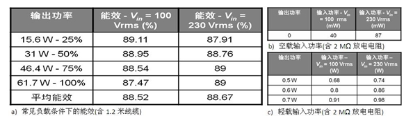 表 1:基于 NCP1250 的 65 W 演電源適配器演示板能效測試結(jié)果。