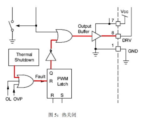 5.欠壓保護(UVP)/反饋環(huán)路異常保護:UVP可以防止在反饋故障條件下啟動。當VFB<8%VPREF=0.2V時,UVP激活,器件關閉;當VFB高于12%VPREF=0.3V時,器件自動開始工作。