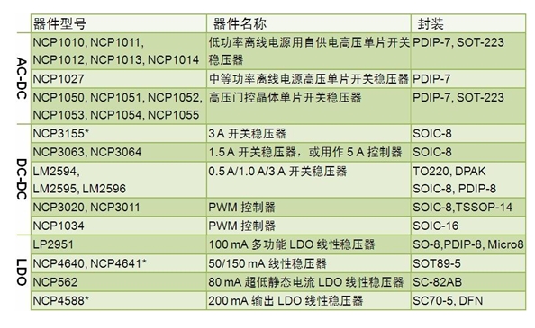 關穩壓器 NCP3155、1.5 A 開關穩壓器 NCP3063/4、0.5/1.0/3 A 開關穩壓器 LM2594/5/6、NCP3020/11 脈寬調制(PWM)控制器及 NCP1034 PWM 控制器。