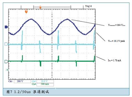 如下的示波器波形有助于理解TBU®高速保護器在不同的瞬態浪涌等級和電力線串擾等方面的三級保護方案中的性能.用如圖3 所示的線路進行演示,不難發現次級的瞬態電壓抑制器中流過的能量已經很小,TBU 上面流過的電流相對于浪涌電流來說也是微乎其微。