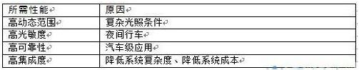 考慮到夜間行車,有些道路沒有路燈或者路燈很暗,汽車視覺系統也需要在低光照場景下采集路況信息。針對汽車應用,圖像傳感器需要滿足一系列汽車級要求,如寬溫度范圍、高可靠性、高集成度、低成本等。表1總結了汽車視覺系統中圖像傳感器應該具有的性能: