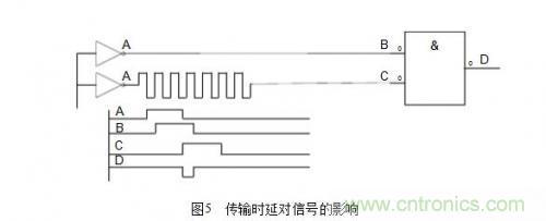 (3)保證信號在PCB上可靠的傳輸,確保信號的完整性。這里面主要的問題一般包括時延、阻抗不匹配、地彈跳、串音等。這不但影響到電子器件的穩(wěn)定工作,還會產(chǎn)生電磁干擾。一般在高速邏輯設(shè)計(jì)中最容易碰到時延問題,處理不好會產(chǎn)生不希望的脈沖干擾。傳輸時延對信號的影響如圖5所示。