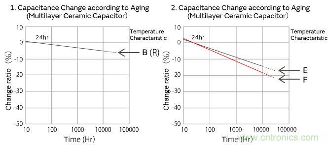 高誘電系的積層陶瓷電容器的靜電容量,以經(jīng)過(guò)125℃以上的熱處理24小時(shí)后的值作為基準(zhǔn),與時(shí)間成對(duì)數(shù)關(guān)系直線(xiàn)性下降。請(qǐng)參考如下村田制品靜電容量老化特性的代表例子。