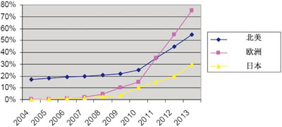 圖2 北美、歐洲、日本緊急呼叫系統市場占有率