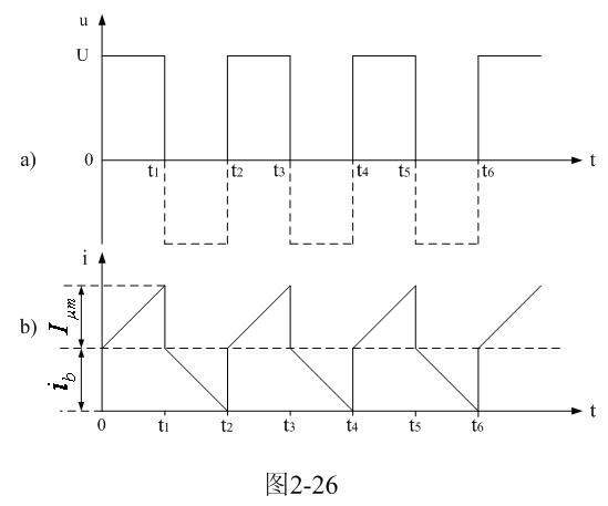 圖2-26是圖2-25電路中變壓器初級線圈兩端電壓以及電流波形圖。圖2-25中,通過改變控制開關K的占空系數,可使變壓器初級線圈正好工作于電流臨界連續狀態或電流斷續狀態,即:流過變壓器初級線圈中的電流在下一次控制開關K接通之前為0。