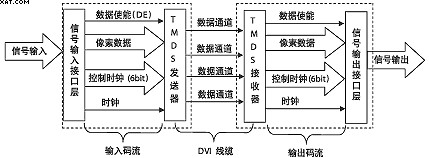DVI是基于TMDS(TransitionMinimizedDifferentialSignaling,轉換最小差分信號)技術來傳輸數字信號,TMDS運用先進的編碼算法把8bit數據(R、G、B中的每路基色信號)通過最小轉換編碼為10bit數據(包含行場同步信息、時鐘信息、數據DE、糾錯等),經過DC平衡后,采用差分信號傳輸數據,它和LVDS、TTL相比有較好的電磁兼容性能,可以用低成本的專用電纜實現長距離、高質量的數字信號傳輸。TMDS技術的連接傳輸結構如圖1所示。