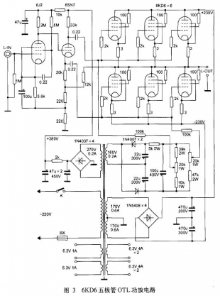 對于普通功率電子管改成三極管接法的OTL功放來說,并不是所有功率管均能采用,必須選用屏極電壓范圍較大的束射四極管或五極功率電子管,如6KD6、6L6、6P3P、6146等。同時,功放級還必須采用多只功率管并聯的方式,在8Ω低阻抗負載時,每聲道采用6只功率管并聯才能符合低阻抗負載的要求,并且輸出功率僅為30W左右。