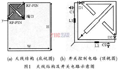 在天線的方向圖可重構方面,目前的研究主要集中在采用八木形式的結構上。即通過開關控制來改變反射器或引向器的有效諧振長度,從而實現反射或者引向作用,使天線的輻射方向發生變化。但是,這種方式需要多個天線。故在手持終端有限的空間下,采用這種方式有很大的困難。另外,在天線極化方式可重構方面,研究的重點也是單貼片的天線,即通過在天線上開槽或者采用多條饋線,并在不同位置安裝開關來改變開關的狀態從而實現極化方式的變化,但是,這種天線的面積較大,同時采用多條饋線的結構太復雜,都不適用于實際的移動設備。