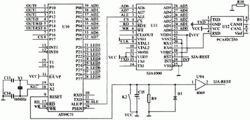 圖2CAN總線控制器、總線驅動器和單片機連接圖