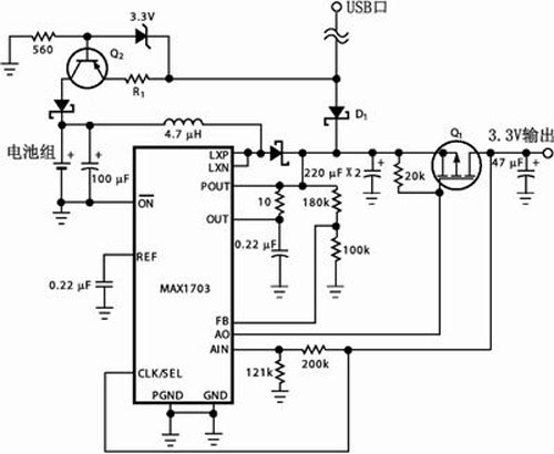 不少便攜式USB設備脫離主機后改由內(nèi)部電池組通過直流變換器繼續(xù)供電,故而需要配備一個小型UPS電源,圖3便是一種由單片開關電源MAX1703構成的實用電路。該集成器件采用同步整流PWM升壓型電路結構;可以單節(jié)鎳鎘/鎳氫電池供電,最低輸入電壓0.7V,輸出電壓可調(diào)范圍為2.5~5.5V,最大輸出電流1.5A,電源變換效率可達95%。圖3中,MAX1703開關電源“POUT”端的輸出電壓設定為3.4V,而由P溝道場效應管Q1與片內(nèi)備用放大器構成的線性穩(wěn)壓器輸出電壓為3.3V,故而USB外設由電池組供電時Q1的功率損耗幾乎可以忽略。外部設備與USB口接通時,二極管D1為正向偏置而使開關電源處于“空閑”狀態(tài);也就是只要Q1的源極電壓高于3.4V,外部設備便始終由USB口供電。與此同時,USB口還通過PNP晶體管Q2等組成的恒流源向電池組充電,調(diào)整電阻R1的阻值可以設定充電電流,使之符合十小時充電制的要求。一旦外部設備脫離USB口,開關電源便會立即退出“空閑”狀態(tài)而由內(nèi)部電池組繼續(xù)供電。