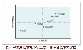 應用Frost&Sullivan公司GEM研究方法,從增長戰(zhàn)略及實施力兩個緯度,綜合評估中國通信電源市場主要供應商,如圖4所示。