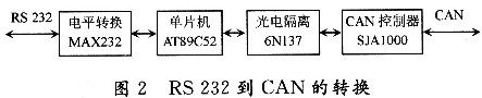 RS232串口的幀格式為:1位起始位,8位數據位,1位可編程的第9位(此位為發送和接收的地址/數據位),1位停止位。而CAN的數據幀格式為:幀信息+ID+數據(可分為標準幀和擴展幀兩種格式)。因此,設計時就需要有一個微控制器來實現電平和幀格式等的轉換,其轉換方式如圖2所示。