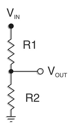 普通電阻型分壓器由兩個電阻串聯(lián)而成(如圖1所示)。電壓從分壓器的頂端輸入,由兩個電阻之間的節(jié)點輸出,而參考電壓(通常是接地電路)則連接在分壓器的底端。