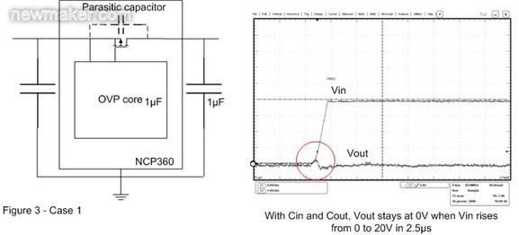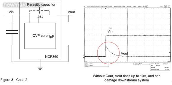 在圖3的案例2中,輸出電容已被移除。這樣,當OVP器件輸入端出現快速輸入瞬態現象時,旁路元件將保持開路。這時可以在輸出端觀察到過沖,這個過沖可能會損壞連接至OVP輸出端的電子元器件。為了解決這個問題,必須在輸出引腳上連接一個輸出電容,并盡量靠近OVP 器件擺放。