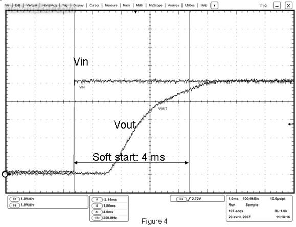 即便出現Vusb或墻適配器快速輸出上升(熱插),在器件的Vout端也觀察不到電壓尖峰,這得益于4ms的軟啟動控制。這種保護的最關鍵特性是能以最快速度檢測到任何過壓情況,然后將內部FET開路。