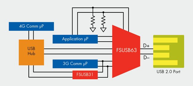 4G手機(jī)的最新趨勢是在手機(jī)中集成兩個(gè)處理元件,同時(shí)訪問USB端口。對于這種應(yīng)用,一個(gè)比較好的選擇是采用集線器。不過麻煩在于USB集線器的接線通常是電容性的,功耗相當(dāng)大;而另一方面,同時(shí)訪問USB端口的機(jī)會(huì)又不多。圖2所示為這種手機(jī)的一種設(shè)計(jì)方法,其中,3G通信處理器必需與4G處理器分開來單獨(dú)訪問USB端口。通過一個(gè)隔離開關(guān)(FSUSB31),并采用極短的PCB引線,可以盡量減小電容。這樣一來,在從3G通信處理器到USB主設(shè)備的路徑上,一個(gè)高速發(fā)射USB數(shù)據(jù)眼(data eye)與USB規(guī)范相比有很大的裕量。在這個(gè)例子中,應(yīng)用處理器控制USB 3:1多路復(fù)用開關(guān),當(dāng)后者在待機(jī)模式下處于低電狀態(tài)時(shí),它可以讓自己的控制線路上的上拉和下拉電阻連接到默認(rèn)的應(yīng)用處理器。