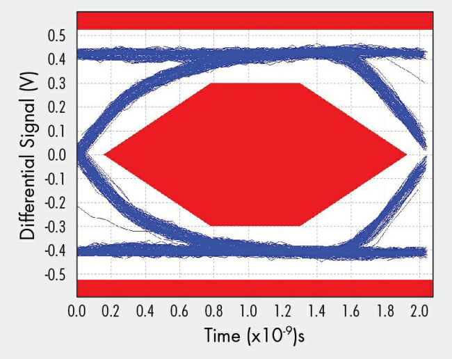 對于大多數(shù)集成電路而言,高速和低功耗一般是一對相互矛盾的特性。能夠兩者兼具的解決方案常常需要降低電壓,并使用精細(xì)的幾何工藝尺寸;然而,USB規(guī)范要求的是高電壓信號。在性能穩(wěn)健的手機(jī)設(shè)計(jì)中,D+和D-信號能夠承受至5V VBUS信號線的短路,故限制了低電壓解決方案。不過,最近推出的低功耗電荷泵USB開關(guān)解決了這個(gè)問題,并滿足嚴(yán)苛的USB發(fā)射眼圖要求,如圖3所示。事實(shí)上,無需對架構(gòu)或所選器件做任何修改,大多數(shù)這類設(shè)計(jì)的工作速率就能夠達(dá)到高速USB數(shù)據(jù)速率(> 1 Gbps)的兩倍以上。