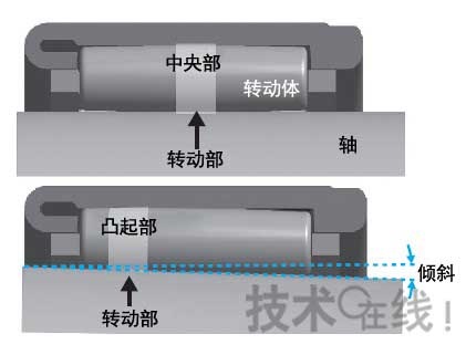 (圖2·噪聲增大的機制:軸傾斜時,滾動體的滾動部從中央部向凸起部移動。凸起部的精度比中央部低,因此產生不穩,使得噪聲增大)