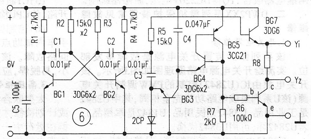 電路圖中的BG1、BG2、R1~R4、C1、C2等組成多諧振蕩器,BG3~BG5、C3、C4等組成階梯波發生器,詳細工作原理讀者可自行分析,這里就不一一贅述了。