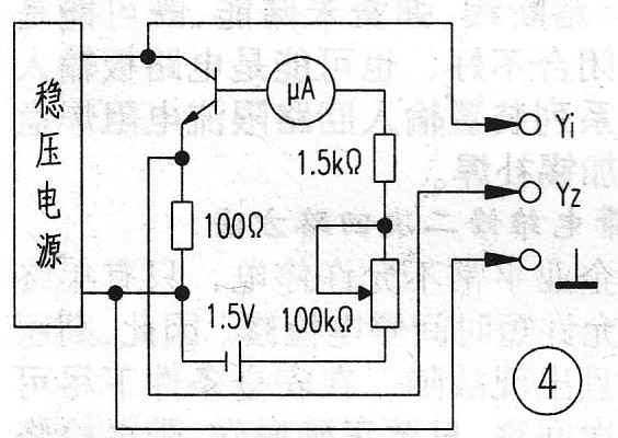 測試方法:把圖4連入示波器,從圖中可以看出:X軸通道信號反映了集電極、發射極偏置電壓的大小,Y軸通道的信號反映了該電路中三極管Ic的變化,示波器耦合開關置“DC”擋。斷開1.5V電源,Ib=0,則示波器上出現—條水平亮線。通入1.5V電源,調整100kΩ電位器值的大小,分別使Ib為20uA、40uA、 60uA、 80uA, 則示波器屏幕上將依次掃描出四條曲線,如圖5所示。由此可以很方便地測出該晶體管的直流放大倍數,并從曲線的線性度上判別管子的優劣程度。