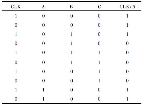 采用基于D 觸發(fā)器結(jié)構(gòu)的五分頻器邏輯框圖如圖1所示。圖1 由3 個D 觸發(fā)器和少量邏輯門構(gòu)成, 采用了同步工作模式, 其原理是由吞脈沖計數(shù)原理產(chǎn)生2 個占空比不同的五分頻信號A 和B, 然后對時鐘信號CLK, A 和B 進行邏輯運算得到占空比為50% 的五分頻信號CLK/ 5, 其計數(shù)過程如表1 所示, 從表1 的計數(shù)過程可知, 分頻后的時鐘CLK/ 5 的周期是輸入時鐘CLK 的5 倍, 由此實現(xiàn)了五分頻并且其占空比為50% .