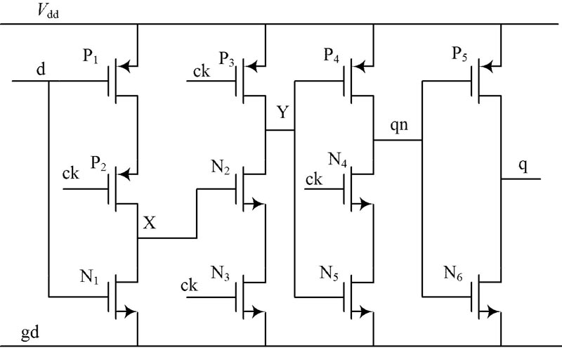 TSPC 電路構(gòu)成的觸發(fā)器如圖3 所示, 由圖中可以看出, 該電路由四級反相器構(gòu)成, 上升沿觸發(fā), 當CK 為低電平, 輸入反相器在節(jié)點X 上采樣反向d 輸入,第2 級反相器處于保持狀態(tài), 節(jié)點Y 預充電至V dd,第三級反相器處于保持狀態(tài), 時鐘上升沿來時, 第二級反相器求值, Y 的電平值發(fā)生變化, 時鐘ck 為高電平時,節(jié)點Y 的值傳送到輸出q, 該觸發(fā)器的延時為4 個反相器的傳播延時, 由于電路中元件數(shù)目很少, 而且采用動態(tài)邏輯, 因此功耗極低。