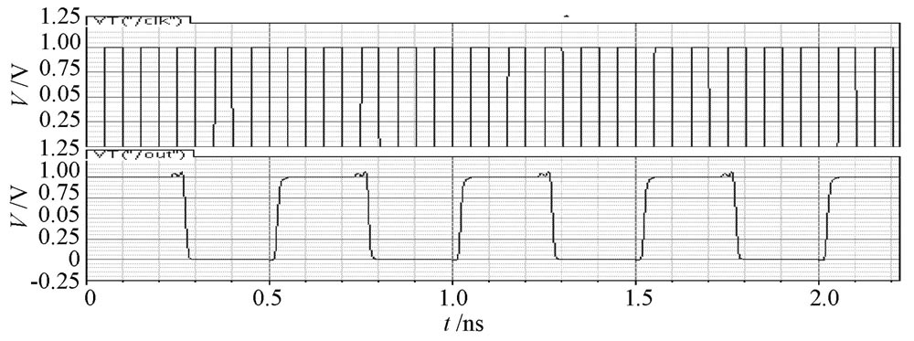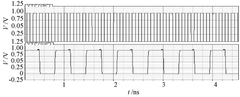 本文基于65 nm 工藝分別采用CML 電路結(jié)構(gòu)和TSPC 電路結(jié)構(gòu)設計了1 個五分頻器, 采用spectr e 仿真表明, 采用CML 結(jié)構(gòu)的分頻器最高工作頻率8 GHz,功耗1. 7 mW, 輸出信號占空比49. 76% ; 采用T SPC 電路結(jié)構(gòu)分頻器最高工作頻率10 GHz, 功耗為0. 2 mW,輸出信號占空比49. 91%, 由于采用單端輸入輸出, 所以采用T SPC 結(jié)構(gòu)的分頻器抗噪聲能力較弱。輸出信號占空比為50% 是本文一大特點, 2 種結(jié)構(gòu)的分頻器工作頻率完全覆蓋了U SB 3. 0 協(xié)議所要求的頻率范圍,滿足協(xié)議要求。