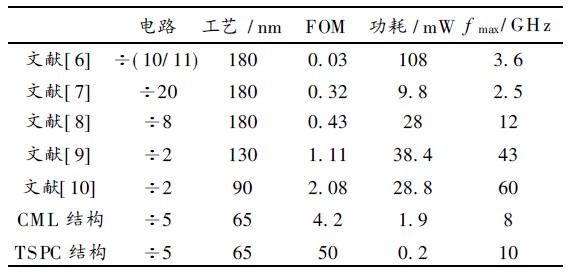 式中: fmax 是分頻器的最高工作頻率; P 是分頻器在最高工作頻率下的功耗, 表2 為本文設計的分頻器和其他文獻中介紹的分頻器作對比,所有的分頻器均采用CMOS工藝, 對比表明本文設計的5 分頻器性能較優(yōu),在65 nm 工藝下具有明顯的功耗低優(yōu)勢, 尤其是采用TSPC 電路結(jié)構(gòu)的分頻器, 功耗極低。