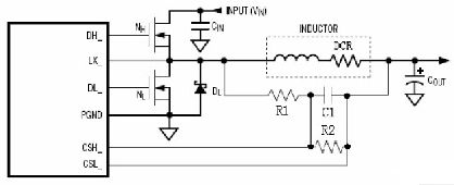 由于輸出電壓低,那么電流比較器的兩個(gè)輸入管腳的共模電壓較低,因此可以使用低輸入共模電壓的差動(dòng)放大器,提高電流檢測(cè)的精度,降低噪聲。這種配置另一個(gè)大的優(yōu)點(diǎn)是可以使用電感的DCR作為電流檢測(cè)電阻。要注意的是,在電感值和飽和電流滿足整個(gè)輸入電壓范圍和輸出負(fù)載電流范圍的前提下,對(duì)電感的DCR有一定的限制,因而在一些應(yīng)用中需要定制電感。此外,電流比較器的輸入阻抗要大,兩個(gè)輸入管腳的偏置電流要小,從而提高使用DCR作為電流檢測(cè)電阻時(shí)的檢測(cè)精度。相關(guān)的濾波元件也在設(shè)計(jì)作相應(yīng)的匹配,如下圖所示。