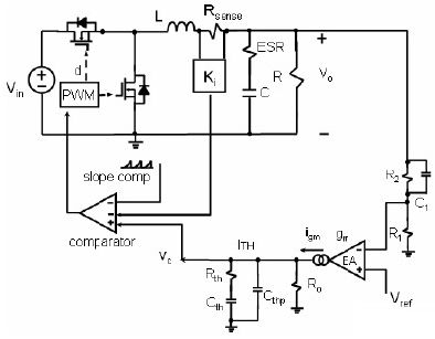 前面的討論知道:輸出回路電感的電流波形為包含上升和下降階段的鋸齒狀波形。因此電流取樣電阻在輸出端,變換器可以工作于谷點(diǎn)電流模式,也可工作于峰值電流模式。但通常這種配置工作于峰值電流模式。