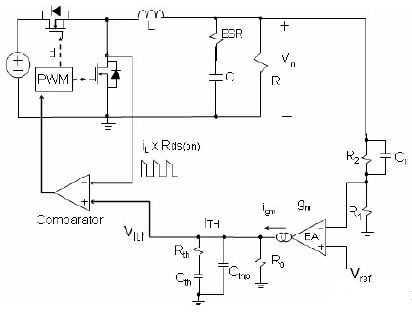 前面的討論知道:在每個(gè)開關(guān)周期,續(xù)流回路即低端的開關(guān)管流過的電流波形為下降階段的梯形狀波形。對(duì)于這種電流模式常稱為谷點(diǎn)電流模式。和峰值電流模式一樣,谷點(diǎn)電流模式反饋也有二個(gè)環(huán)路:一個(gè)電壓外環(huán),另一個(gè)是電流的內(nèi)環(huán)。其工作原理如下:高端的主開關(guān)管開通,電感激磁,電流線性上升;高端 MOSFET的導(dǎo)通一段固定的時(shí)間,此時(shí)間由 PWM 設(shè)定。當(dāng)高端 MOSFET 關(guān)斷后,低端MOSFET 導(dǎo)通,此時(shí)電感開始去磁,電流線性下降。注意到低端 MOSFET 的電流隨著時(shí)間線性下降,電流檢測(cè)電阻的電壓信號(hào)也線性下降,由于此時(shí)電壓外環(huán)的輸出電壓信號(hào)低于電流檢測(cè)電阻的電壓,電流比較器輸出為低電平。當(dāng)電流檢測(cè)電阻的電壓信號(hào)繼續(xù)下降,直到等于電壓外環(huán)的輸出電壓信號(hào)時(shí),電流比較器的輸出翻轉(zhuǎn),從低高電平翻轉(zhuǎn)為高電壓,邏輯控制電路工作,關(guān)斷低端的續(xù)流開關(guān)管的驅(qū)動(dòng)信號(hào),高端的主開關(guān)管開通,此時(shí)電感開始激磁,電流線性上升,進(jìn)入下一個(gè)周期,如此反復(fù)。