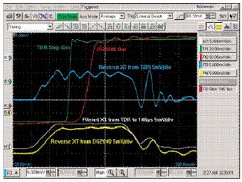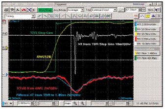 綠色波形是快沿TDR脈沖(R1),白色波形(R4)是由它導(dǎo)致的串?dāng)_。