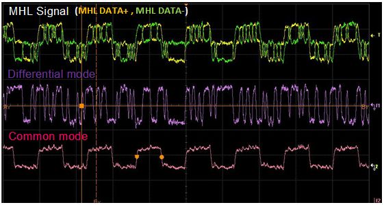 接下來,MHL信號波形的測量結果如圖3所示。圖3中顯示的是MHL信號的差模成分和共模成分。從圖3我們可以清晰地看到MHL信號中不僅存在差模成分 (差分波形) ,還存在著共模成分。