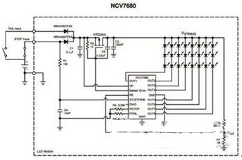 NCV7680集成了眾多功能,支持兩個亮度等級,一級用于停車,另一級用于尾部照明。如果需要,也可使用可選的脈寬調(diào)制(PWM)控制。系統(tǒng)設計人員只需使用一個外部電阻設定輸出電流(整體設定點)。另外,針對要求大電流的設計,可選的外部鎮(zhèn)流器場效應晶體管(FET)可以根據(jù)設計所需的高電流進行功率分配。延遲的功率極限降低了在過電壓狀態(tài)下的驅(qū)動電流。這對于沒有外部FET的低電流應用來說十分重要。