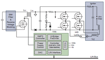 安森美半導體的全功能高強度放電(HID)(或氙燈)專用集成電路有助于改善前燈系統(tǒng)的性能。相對于傳統(tǒng)的鹵素燈,HID改善了顯色性,降低了功耗,使用壽命更長,光輸出更高。為了支持其先進的功能,需要高效率的HID大燈鎮(zhèn)流器和復雜的控制電路。安森美半導體的HID燈控制系統(tǒng)是采用8位微控制器或?qū)S脿顟B(tài)機的混合模擬/數(shù)字解決方案,它集成了DC-DC控制器,具備全面的診斷功能(過壓、欠壓、溫度傳感器、續(xù)航時間計數(shù)器)、各種通信接口(LIN、SPI),支持35 W(D1/D2/D3/D4)和25 W(D5)燈。圖3為該專用集成電路的框圖。