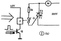正確的方式見圖1b。可控硅與抽水電機組成抽水控制開關(guān),SCR的觸發(fā)由T2與G間接入電阻控制。當(dāng)水位降低時,控制觸點開路,555第3腳輸出高電平(此電路部分省略),使Q導(dǎo)通,繼電器J吸合,SCR觸發(fā)導(dǎo)通,電機開始運轉(zhuǎn)。當(dāng)水位達(dá)到時, 觸點經(jīng)水接通,555第3腳輸出低電平,Q截止,SCR在交流電過零時截止,抽水停止。