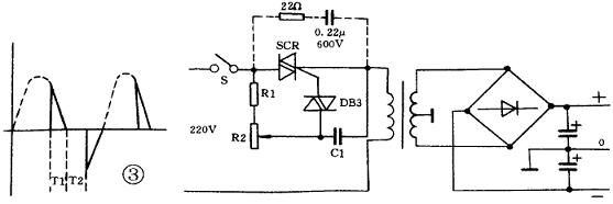 圖3是某電子雜志刊出的無級直流輸出調(diào)壓電路。原作者稱,利用Rc移相網(wǎng)路控制SCR的導(dǎo)通角改變變壓器初級的電流,從而獲得兩路連續(xù)可調(diào)的2x(0—17V) 的直流輸出電壓,負(fù)載電流為800mA 。很明顯,推薦電路(圖3)是普通移相式調(diào)功電路和降壓變壓器整流濾波電路的串聯(lián), 從基本原理分析,似乎無大的原則問題。變壓器初級每半周電流有效值隨可控硅導(dǎo)通角變化,次級輸出電壓的峰值、平均電流值都隨之而變。當(dāng)然,一定負(fù)載時輸出整流電壓也必然改變。本人看后,極感興趣,依此原理制作了一臺輸出100±40V范圍變化的維修代用直流電源,并依照圖中虛線加入RC吸收回路。實驗時,該電路一接入電源,距此10米遠(yuǎn)的電視機屏幕上即出現(xiàn)兩條緩慢移動的黑帶(從鄰居的責(zé)問中得知),同時,空載下不到十分鐘,SCR即擊穿。更不能容忍的是,降壓變壓器鐵心發(fā)出拖拉機啟動時的聲音,室內(nèi)電度表也發(fā)出同樣的聲音,而且,隨著輸出電壓的調(diào)低,聲音更大。