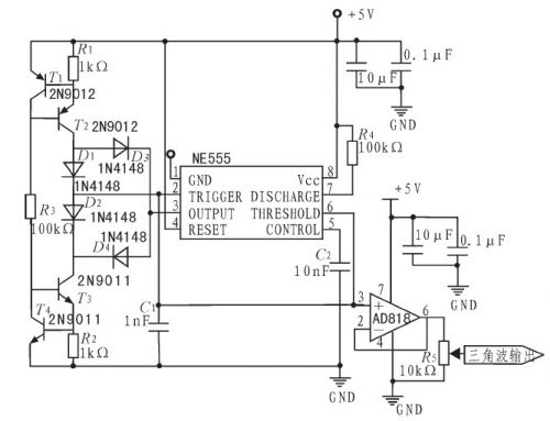 三角波產(chǎn)生電路如圖2所示。采用NE555芯片構(gòu)成三角波電路,通過恒流源對(duì)電容C1實(shí)現(xiàn)線性充放電從而獲得三角波。開始工作時(shí),555芯片3號(hào)腳為高電平,二極管D4導(dǎo)通,D3截止,從而D1導(dǎo)通,D2截止,由T1、T2、R1構(gòu)成的恒流源通過D1對(duì)C1線性充電,當(dāng)充電使C1兩端電壓達(dá)到2/3Vcc時(shí),3號(hào)腳輸出電平發(fā)生反轉(zhuǎn),變?yōu)榈碗娖剑藭r(shí)D1、D2、D3、D4導(dǎo)通狀態(tài)也完全相反,由下方T3、T4、R2構(gòu)成的恒流源通過D2對(duì)C1線性放電,當(dāng)放電使C1兩端電壓達(dá)1/3Vcc時(shí),3號(hào)腳又反轉(zhuǎn)為高電平,如此循環(huán)往復(fù),實(shí)現(xiàn)周期三角波信號(hào)產(chǎn)生。由C1兩端引出輸出,即可得到線性度良好的三角波信號(hào),后接一級(jí)同相跟隨器已達(dá)到前后級(jí)隔離的目的。C1采用漏電流低、響應(yīng)速度快的聚苯乙烯電容,保證較好性能。